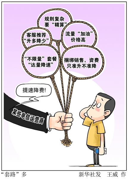 套路五:捆綁銷售,資費(fèi)只準(zhǔn)升不準(zhǔn)降。許多消費(fèi)者在辦理手機(jī)套餐時(shí),運(yùn)營商會(huì)贈(zèng)送寬帶服務(wù),二者資費(fèi)不能單獨(dú)改動(dòng)。深圳王女士去年辦理了某運(yùn)營商的“136元贈(zèng)送寬帶”的電信套餐,但套餐內(nèi)流量只有1GB,且不能更換成其他流量資費(fèi)優(yōu)惠的套餐;如果超流量就必須支付30元1GB的“流量包”。王女士每月實(shí)際通訊費(fèi)超過170元。