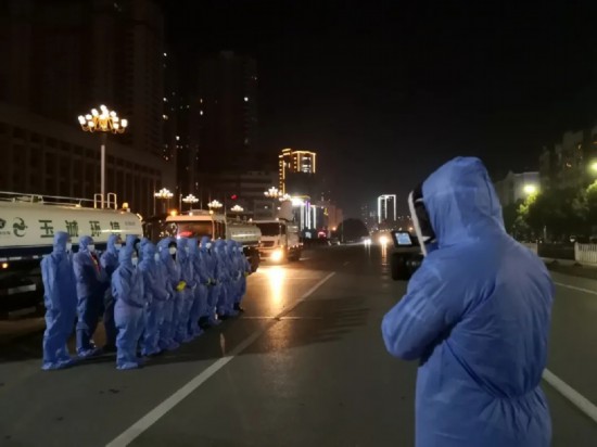 湖北省大冶市融媒體中心記者張偉深夜拍攝大冶城區(qū)“大消殺”工作