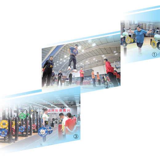 圖②:國(guó)家舉重隊(duì)隊(duì)員丁紅杰(中)進(jìn)行縱跳項(xiàng)目測(cè)試。