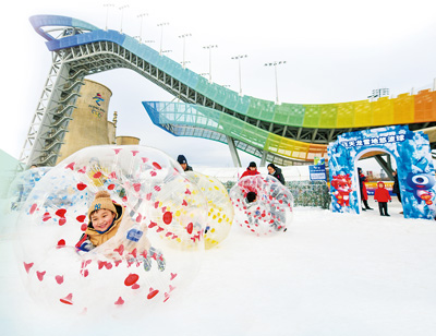 坐落于北京首鋼老工業(yè)園區(qū)的首鋼滑雪大跳臺是2022年北京冬奧會單板滑雪大跳臺及自由式滑雪大跳臺項目的比賽場地,也是世界首例永久保留和使用的大跳臺場地。冬奧會后,大跳臺開展四季全民健身活動,打造專業(yè)比賽訓練場地,持續(xù)推動冬奧場館的可持續(xù)利用。圖為2023年12月,小朋友們在“首鋼園冰雪匯”活動中體驗雪上游樂項目。