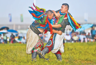 選手在草原那達(dá)慕搏克比賽中。