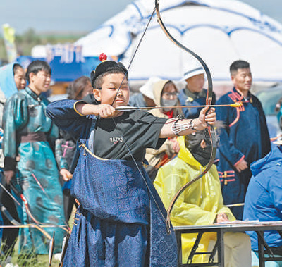 小選手參加草原那達(dá)慕射箭比賽。