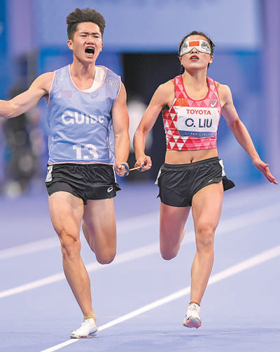 當?shù)貢r間9月3日,劉翠青(右)和領(lǐng)跑員陳圣明在巴黎殘奧會田徑女子100米T11級決賽中。