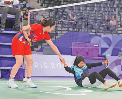 當?shù)貢r間9月2日,巴黎殘奧會羽毛球女子單打SL3級比賽中,肖祖賢(左)幫助摔倒的對手。