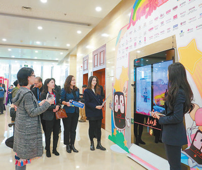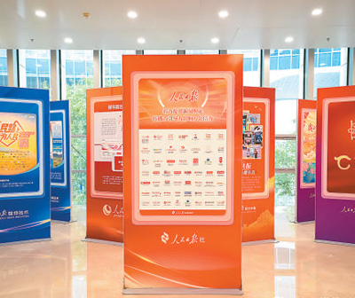 2024媒體融合發(fā)展論壇現(xiàn)場,與會嘉賓在體驗人民日報電子閱報欄拍照打卡功能。