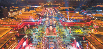 曲江池畔,大唐不夜城燈火輝煌。 西安曲江新區(qū)管委會(huì)供圖 |