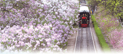 哈爾濱市兒童公園小火車在丁香花海中穿行。