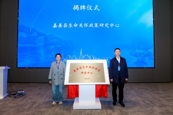 隨后,共富研究中心副主任張躍華主持舉行了“嘉善縣生命關(guān)懷政策研究中心”的揭牌儀式。在全場熱烈的掌聲中,鄧國忠副主任和嘉善縣衛(wèi)生健康局黨委副書記沈月琴上臺共同揭下紅布,標志著這一政校協(xié)作的研究平臺正式啟用。該中心由嘉善縣衛(wèi)生健康局與共富研究中心共同建設(shè)運營,是扎根縣域、面向全國的綜合性政策研究與創(chuàng)新實踐平臺。中心將聚焦生命全周期關(guān)懷與公共服務(wù)優(yōu)化,致力于探索縣域生命健康服務(wù)的創(chuàng)新路徑,助力形成可推廣的“嘉善經(jīng)驗”。