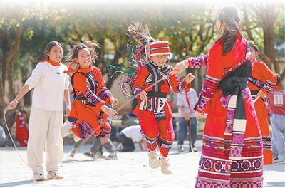 云南曲靖市陸良縣大莫古鎮(zhèn)新村街小學(xué),學(xué)生在操場(chǎng)上跳繩。