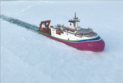 圖為“探索三號”在北極密集冰區(qū)破冰航行。