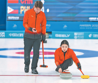 在亞冬會的比賽項目中,冰壺由于賽期較長,在開幕式前就開賽。2月4日冰壺混雙循環(huán)賽打響,這也是中國體育代表團在本屆亞冬會首次亮相。韓雨/王智宇在首場比賽中以11∶5戰(zhàn)勝哈薩克斯坦隊組合,迎來“開門紅”。