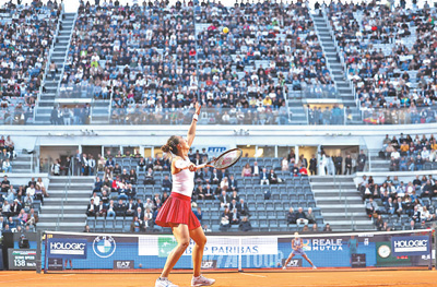 當?shù)貢r間5月14日,鄭欽文在比賽中發(fā)球。