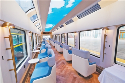 列車功能設計從交通工具向“移動觀景客廳”轉變。全列7節(jié)編組,包含4節(jié)觀光車廂、1節(jié)主題餐車、1節(jié)全景觀光車廂和1節(jié)多功能娛樂車廂,可載客208人,形成集觀光、餐飲、娛樂于一體的移動文化空間。其中,全景觀光車廂和多功能娛樂車廂創(chuàng)新采用超大觀景窗,側頂天窗與頂部LED天幕無縫銜接,給旅客帶來“車在景中行,人在畫中游”的體驗。4節(jié)觀光車廂內設有車廂卡座、對窗座椅區(qū)。