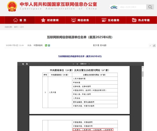 7月2日,國(guó)家互聯(lián)網(wǎng)信息辦公室公布最新版互聯(lián)網(wǎng)新聞信息稿源單位名單(截至2025年6月),人民周刊、人民周刊網(wǎng)、人民財(cái)經(jīng)網(wǎng)和人民研學(xué)網(wǎng)在列。