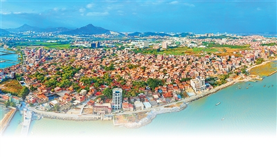 若是從空中俯瞰福建泉州南安市石井鎮(zhèn)奎霞村,便會(huì)看見這樣迷人的風(fēng)景——一側(cè)是蔚藍(lán)的海水,一側(cè)是連棟成片的紅磚古厝,其間點(diǎn)綴青白色的石基、雪白的山花和綠色琉璃花飾,碰撞出一幅色彩鮮明的畫卷。2023年,奎霞村被列入第六批中國(guó)傳統(tǒng)村落名錄。