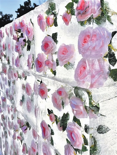 沈陽市南湖公園設(shè)立的冰封玫瑰墻。