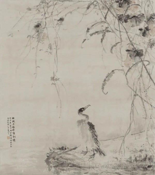 而當(dāng)傳統(tǒng)筆墨遇見時代精神,萬鳴先生的創(chuàng)作更顯其文化擔(dān)當(dāng)與時代回響。他一方面汲取傳統(tǒng)滋養(yǎng)創(chuàng)作,另一方面又將現(xiàn)代造型圓融地融入其間,實現(xiàn)“致廣大而盡精微”的創(chuàng)造性融合,在禽鳥飛影與山石垂藤間傳遞著萬物和諧的生態(tài)哲思。