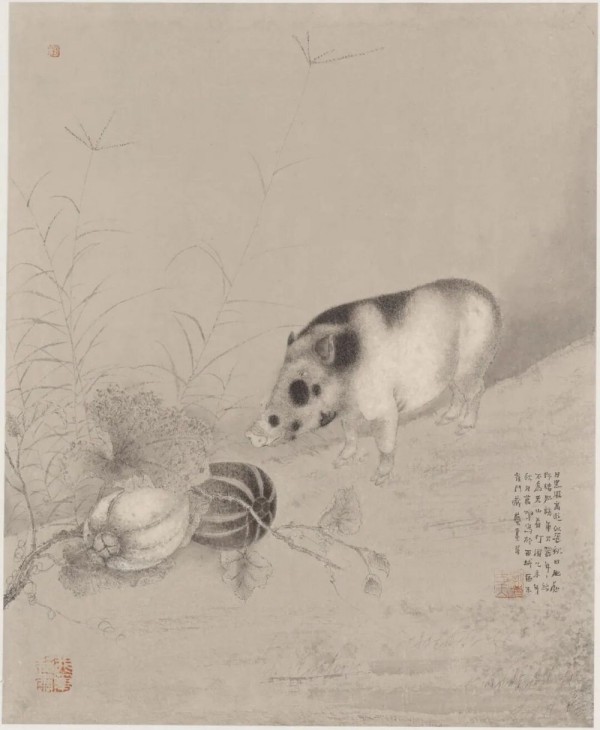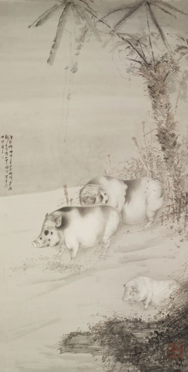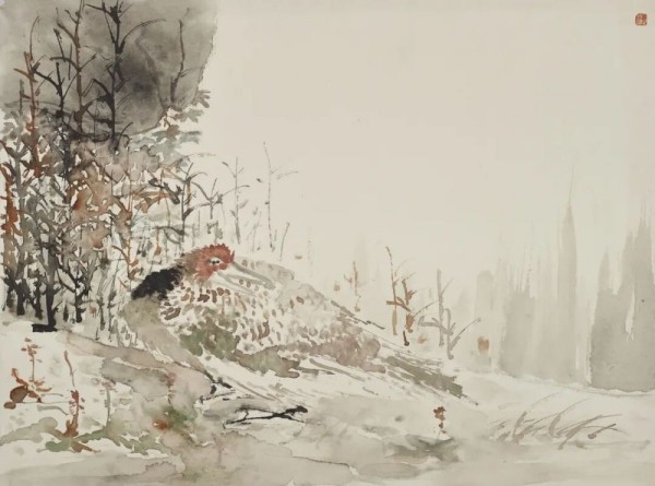 他秉持生活是藝術(shù)的源泉,常年深入鄉(xiāng)村田野,以畫筆反復(fù)推敲自然中一草一木的鮮活氣息。那些憨態(tài)可掬的豬群、靈動矯健的春鳥、靜謐沉思的人物,皆源于對生活的赤誠觀察。在他眼中,萬物皆有靈性,無論是珍禽猛獸還是家禽野草,都能在筆墨中綻放出平等的審美價值。