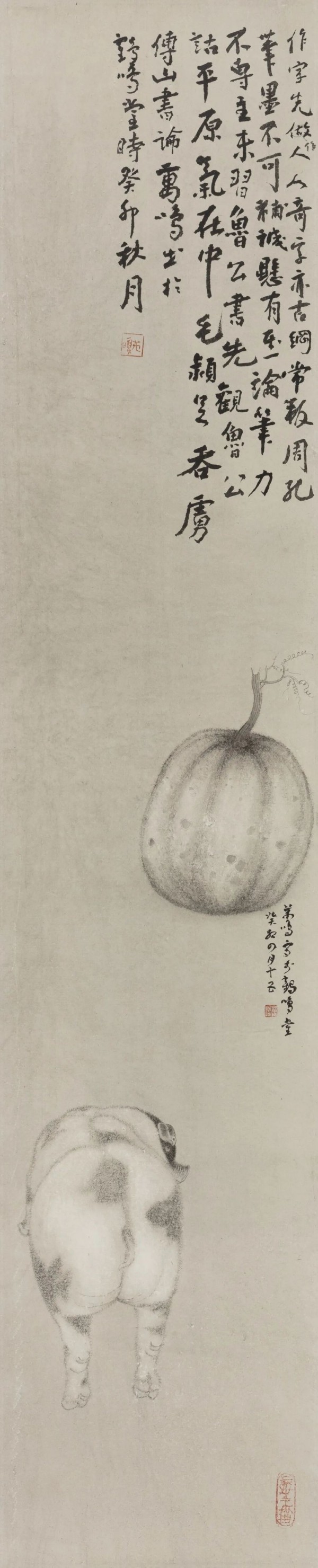 “小品不小”是劉萬鳴先生藝術(shù)的重要面向。此單元“覓趣”之作,直溯兩宋院體花鳥之精髓。他強調(diào)“宋畫給我最大的啟示是‘尊重對象’,在寫生中體會物性之‘真’與‘趣’。” 其筆下貍奴的慵懶、秋蟲的警覺、寒塘的蕭疏,皆是對物象生命狀態(tài)瞬間的捕捉與提純,這是一種深度的“觀物”之得。他巧妙地將宋人的“寫生”轉(zhuǎn)化為個人的“寫意”,用筆更趨松靈,如《蔬香圖》系列,在形準(zhǔn)之上更重神完,于簡約中蘊含無窮生意。這種“趣”,是物趣,更是筆趣與天趣,是他在與古人對話后,于平凡萬物中覓得的生機與詩意,完美詮釋了“與物為春”的創(chuàng)作心境。