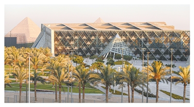 作為古埃及文明的集中地,大埃及博物館選址頗有深意:玻璃幕墻正對約4500年前建造的胡夫金字塔,日光折射下,現(xiàn)代幾何造型建筑與古老巨石在光影中重疊,似乎時間停駐,折疊成可供人們漫步的時空走廊。博物館的3條軸線放射延伸至3座金字塔,如同一幅文明的星圖。