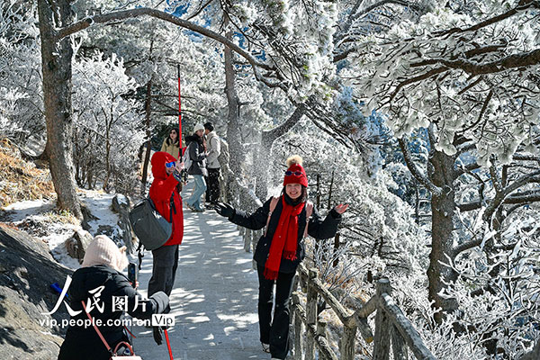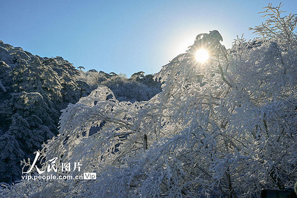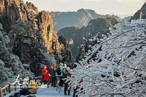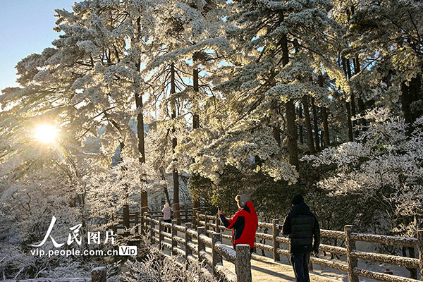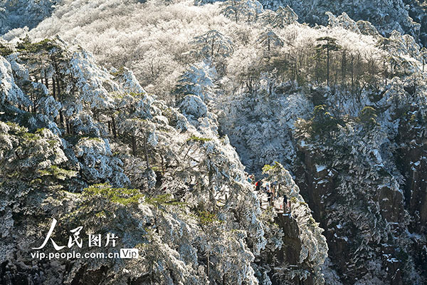 2026年1月7日,安徽黃山風(fēng)景區(qū)迎來(lái)新年首場(chǎng)霧凇景觀,漫山銀裝,玉樹(shù)瓊枝,晶瑩的冰晶綴滿松梢,吸引游客觀賞拍攝。水從澤攝(人民圖片網(wǎng))