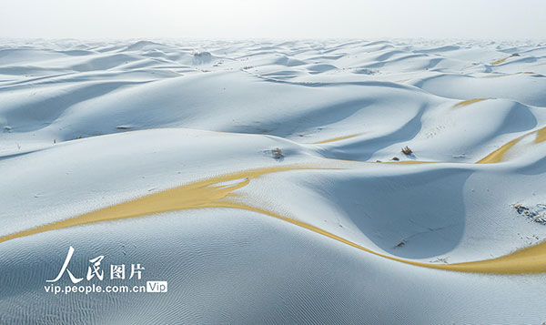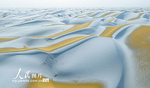 2026年1月29日,新疆巴音郭楞蒙古自治州尉犁縣塔克拉瑪干沙漠邊緣迎來降雪。皚皚白雪覆蓋下的沙海,靜謐而壯美。汪志鵬攝(人民圖片網(wǎng))