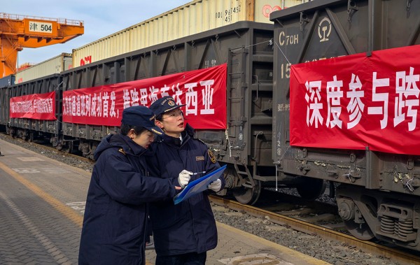 1月19日,海關(guān)工作人員對(duì)出發(fā)前中亞班列進(jìn)行巡查檢驗(yàn)。楊寶森攝