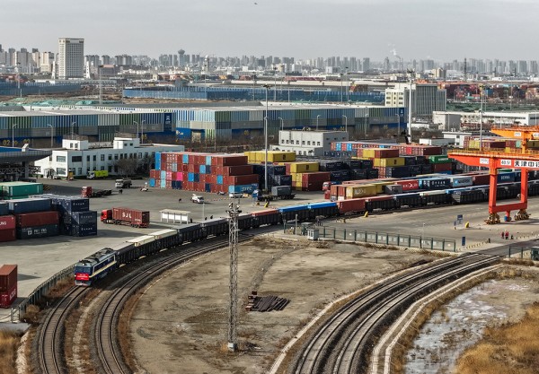 1月19日,首趟天津開往巴庫中亞班列在天津集裝箱中心站準(zhǔn)備發(fā)車。楊寶森攝