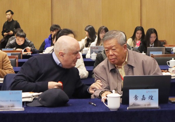 常嘉煌與謝樂教授在研討會上探討交流。本刊記者 何娟攝